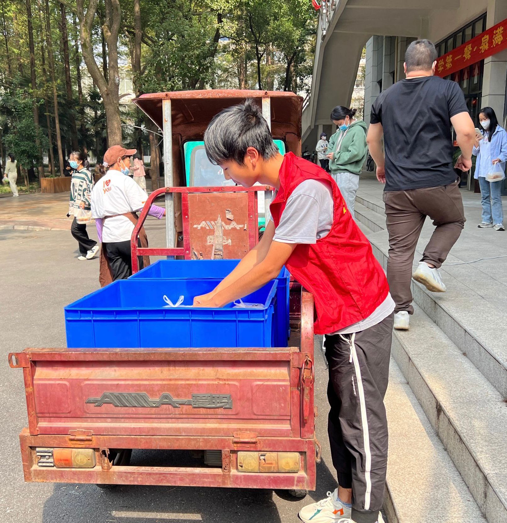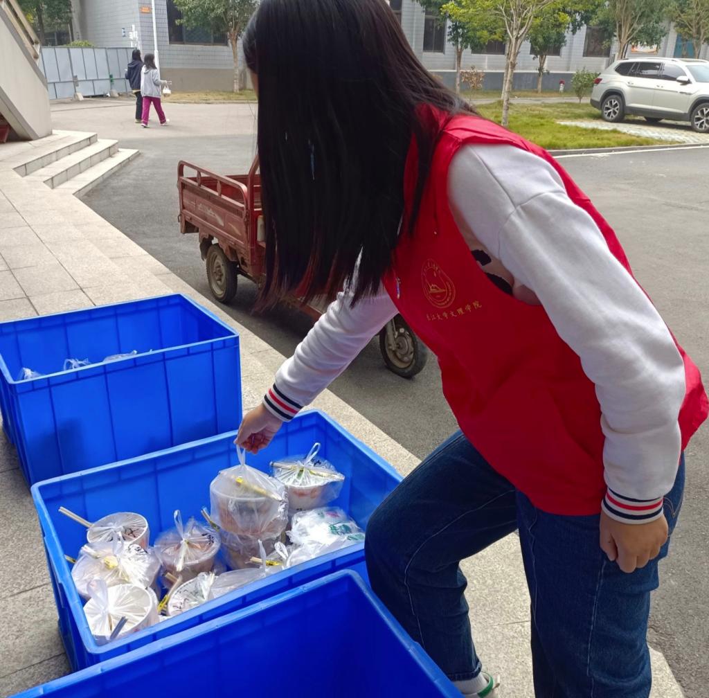 本网讯(通讯员 夏欣)抗疫的硝烟还在弥漫着!为了更加有效控制、加强疫情防控措施。公司决定继续采取校内及校外员工宿舍封闭管理措施,为了解决六舍同学更好的就餐问题,于2022年10月16日,在我系沈书记、胡书记的组织安排下,有序开展“配送餐饮的志愿活动”。系部员工干部、员工党员、入党积极分子等主动承担为六舍员工送餐等后勤保障服务,切实保障隔离员工的生活需求。