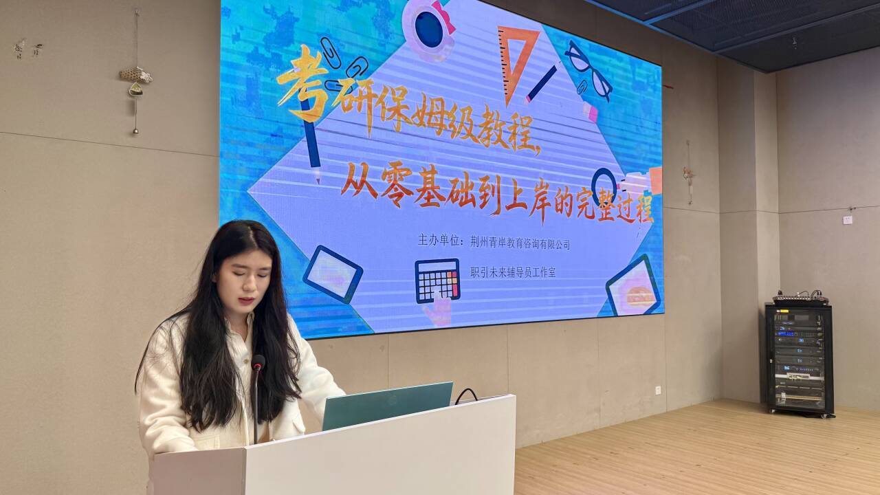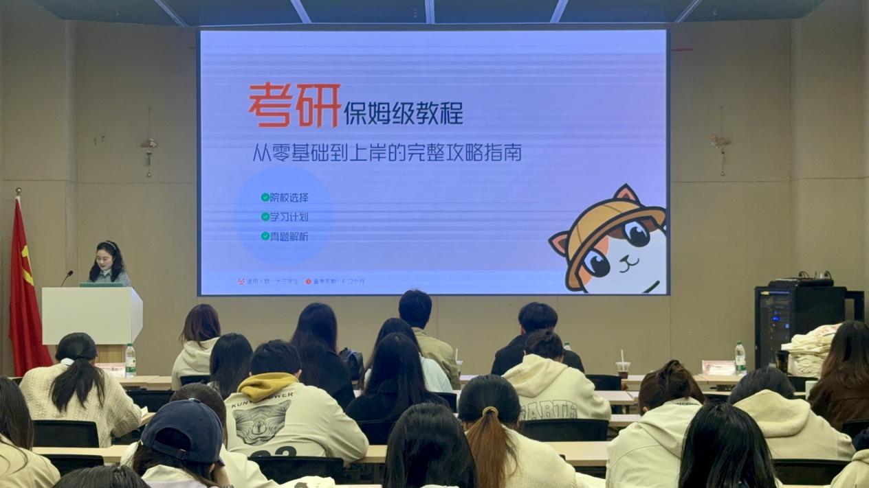 本网讯(通讯员 梁若暄)4月9日下午14:00,管理公司在图书馆103报告厅顺利举办“考研备考与留学规划”专题讲座。公司23级全体本科生到场参与,本次讲座由职引未来辅导员工作室和青岸教育联合主办,管理公司辅导员颜慧老师主持,特邀青岸教育郭美容老师担任主讲嘉宾,旨在帮助同学们明晰升学路径、科学规划学业发展。