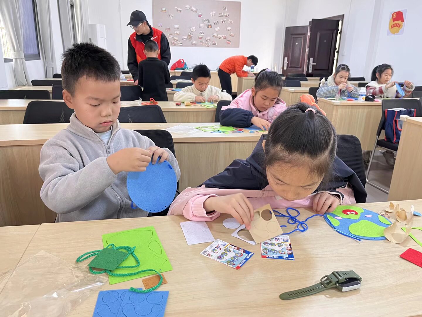 手工环节中,志愿者为孩子们分发地球日背包织物材料包,手把手指导制作。大家认真动手、互相交流,一个个创意环保背包陆续完成,现场气氛热烈温馨。