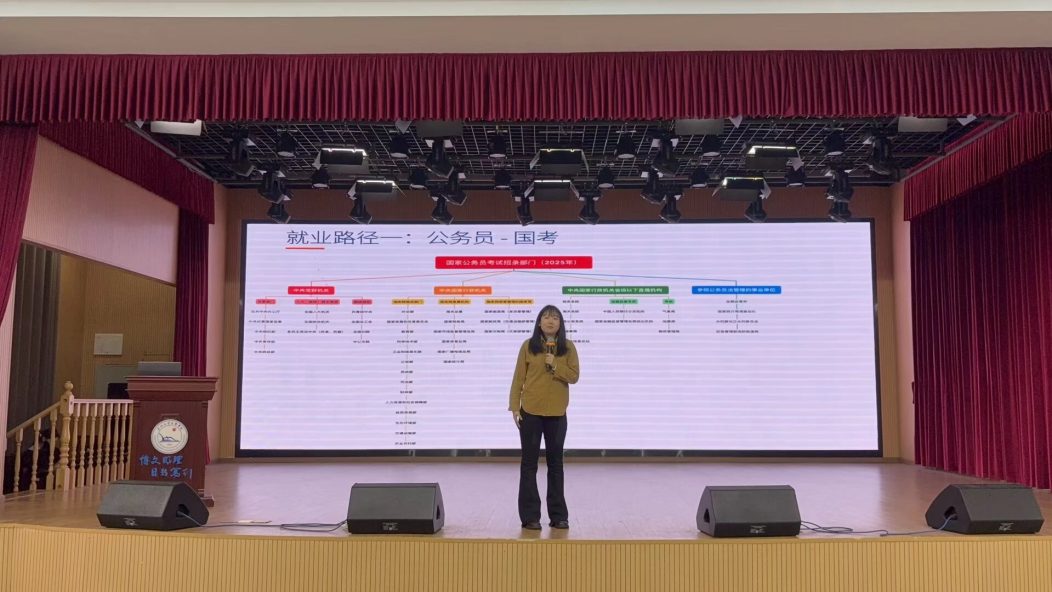 3 月 26 日,“就业升学全攻略” 专题讲座在城中校区食堂三楼报告厅举办,特邀中公教育公职考试与国企招聘研究院资深讲师王静文老师主讲。本次讲座以 “规划未来,赢在起点” 为核心主题,从就业方向解析、升学路径选择、备考技艺分享三大维度展开深度讲解。
