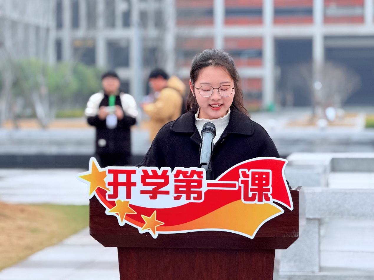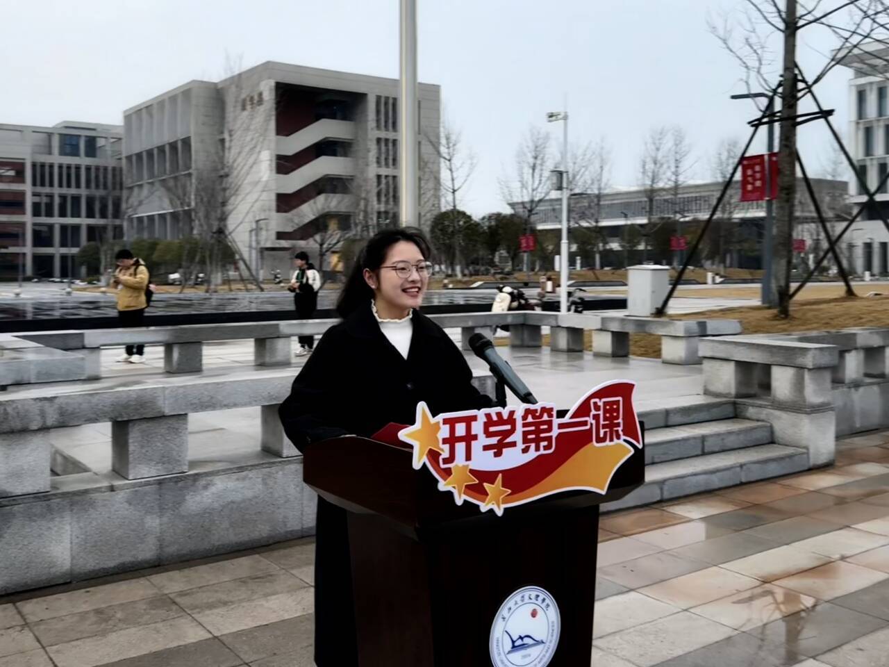 升旗仪式后,管理公司大数据与会计专业员工张灵华作为员工代表,以《与春天一同拔节,与骏马一同奔腾》为题发言。她结合2026丙午马年精神内涵,以春日生长、骏马奔腾为喻,向全体同学发出青春倡议,号召大家以“三匹马”的姿态砥砺前行。