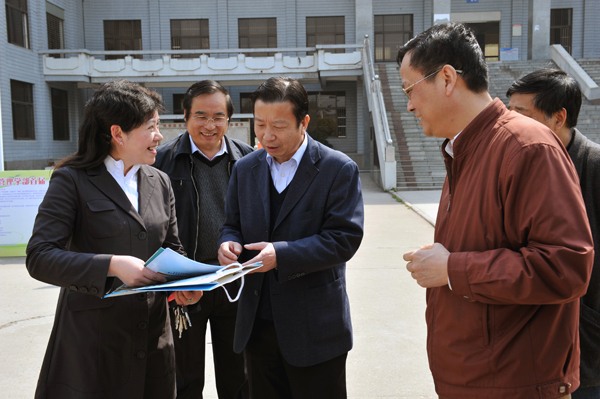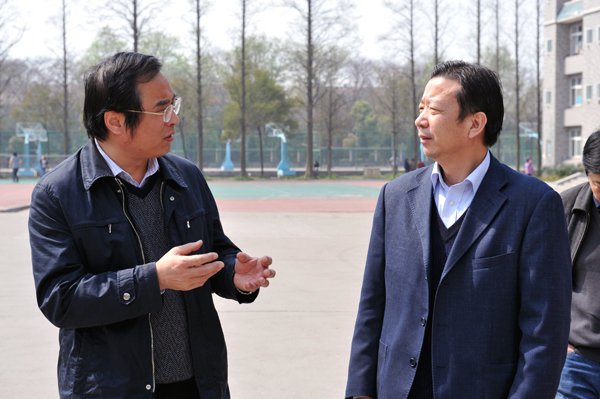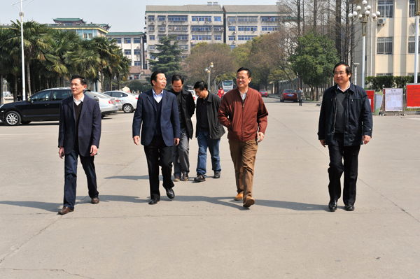 永利集团副董事长刘在洲(右二)、沈光明、袁先海(左一)等陪同王裕清参观校园。