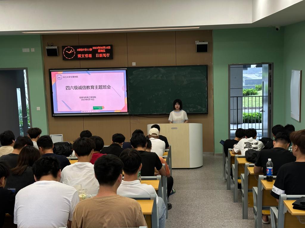 班会开始,辅导员宣读《英语四六级考试诚信教育倡议书》,围绕“考试纪律”、“考试注意事项”两个方面,向同学们表明了考试的重要性,并要求同学们端正考试态度,做到诚信应考。随后,辅导员通过讲述因考试作弊而被处分的例子,告诫同学们要严格遵守考试规章制度,认真复习,积极应考。最后,辅导员祝愿同学们在考试中取得优异成绩。