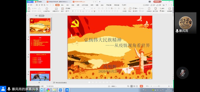 呙明辉代表教工支部委员向全体党员汇报了上半年的工作,提出了下半年工作安排。最后,他以《弘扬伟大民族精神--从疫情视角看世界》为主题,给全体党员讲党课。中国共产党是中国特色社会主义事业的领导核心,在这次疫情中充分显示了中国共产党的先进性,党中央的坚强领导,展现出中国速度、中国规模、中国效率,集中力量办大事,体现出鲜明制度优势和治理效能,在这次的“大考”应对中,进一步完善制度体系与治理体系。