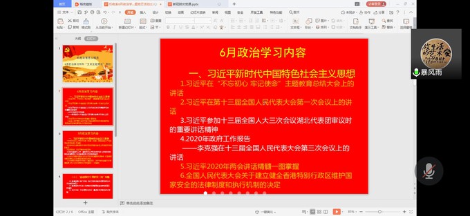 本网讯(通讯员 成观雄)6月23日晚上7点,我系党总支在腾讯会议室召开网络学习会,开展6月份政治学习和“支部主题党日”活动。会议由教工党支部书记呙明辉主持。