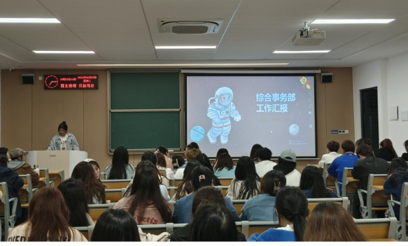 在纪检部宣读到会人员情况后,会议正式开始。各部门代表上台进行工作汇报,现场氛围活跃。雷昕书记肯定了近期工作,指出目前存在的不足,提出大家应提高工作积极性,增强责任意识、加强创新思维,恪守员工本分,积极发挥模范带头作用。最后,老师们和主席团共同分析了各部门的工作现状,对后续工作的有效开展寄予了殷切期望。