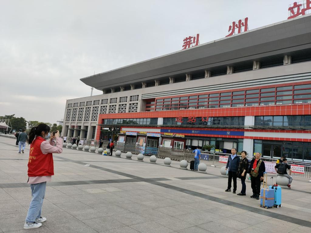 “下雨不缺岗,文明服务不懈怠。”阴雨连绵的天气仍挡不住志愿者们的激情和热情。在负责人的带领下,所有志愿者分成九个小组,各小组成员分别前往荆州火车站售票大厅、站前广场、荆楚大道7个红绿灯路口等地,有序地开展交通文明宣传、火车站售票咨询服务、交通路线咨询服务等工作。
