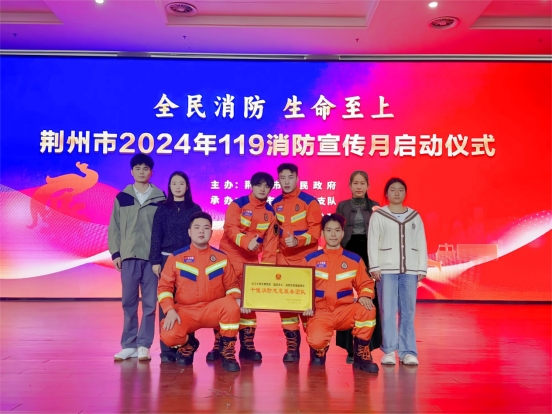 本网讯(通讯员 程悦)11月8日,荆州市2024年“119”消防宣传月启动仪式在荆州职业技术公司举行。仪式上对全市消防工作先进集体和个人进行了表扬,yl6809永利集团人文与传媒公司公司“蓝焰赤心”消防志愿服务队凭借长期在消防安全教育宣传、消防知识科普、火灾隐患排查和逃生初期扑救和逃生自救技能等方面的优异表现首次被评为荆州市2024年“十佳消防志愿服务团队”的称号。