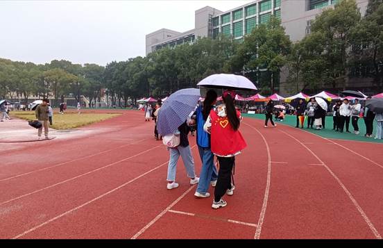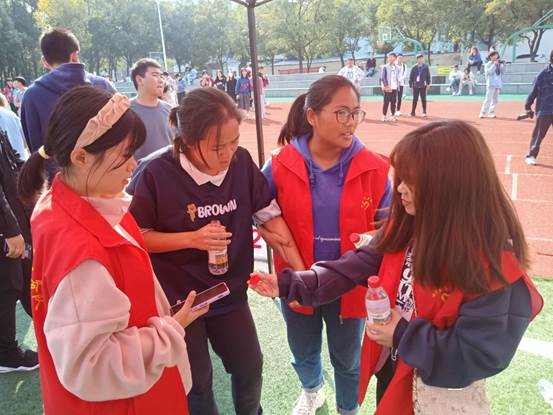 志愿者们在跑道旁,将大汗淋漓的运动员搀扶到我系的休息处,在休息处等待的志愿者帮运动员取下田径运动服、端上热水。即使在雨天,志愿者依旧坚守在自己的岗位,有条不紊地服务着我系参赛运动员,并且时刻关注着我系运动员的状态,及时提供帮助。田径场里随处可见七色花志愿者们的身影。