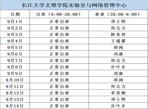 根据网络安全工作部署和上级部门最新通知要求,做好2024开学重要时期(9月1日至9月14日)网络安全保障工作,严格执行7×24小时值守和领导带班制度,保持通讯联络畅通,现将值班安排如下。