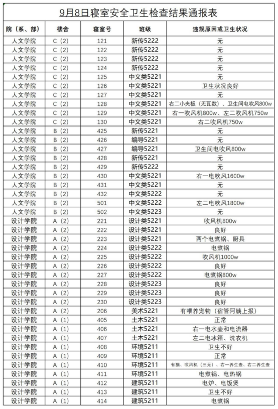 2023-2024学年第一学期第二周寝室安全卫生检查结果通报