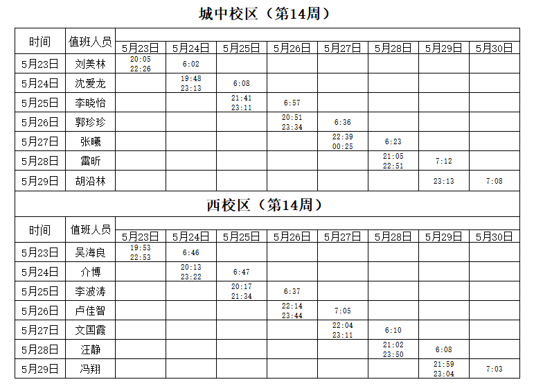 2021-2022学年第2学期第14周学工人员寝室值班通报