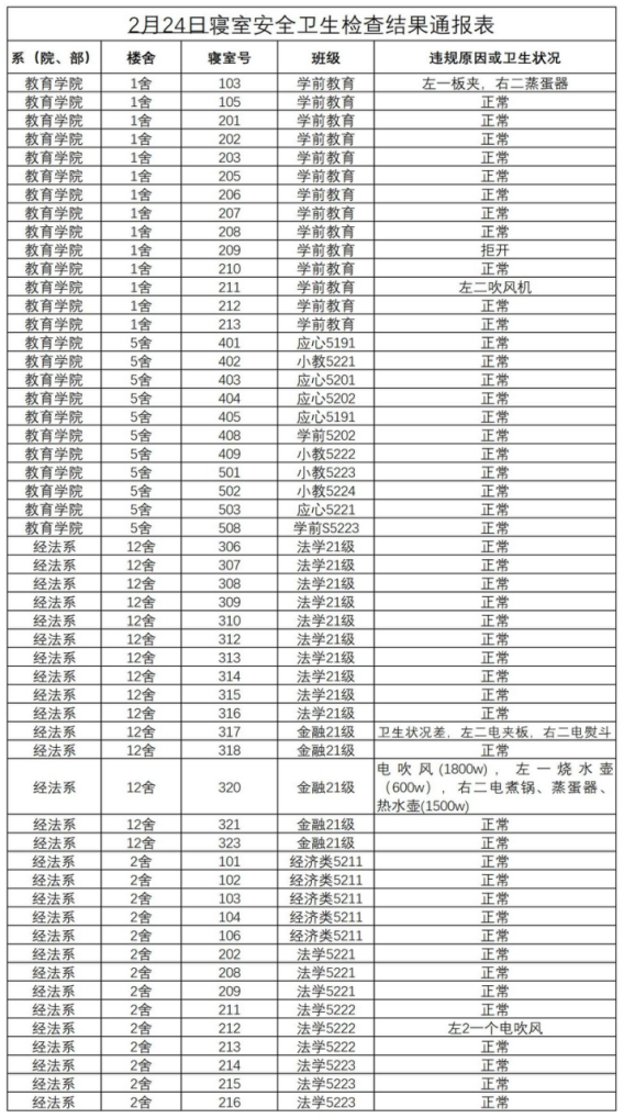 2022-2023学年第二学期第二周寝室安全卫生检查结果通报