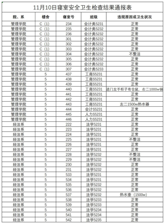 2023-2024学年第一学期第十一周寝室安全卫生检查结果通报