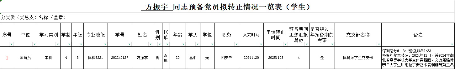 附: 方振宇 同志预备党员拟转正情况一览表