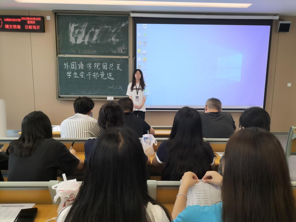 (通讯员 杨吉)6月25日,yl6809永利集团于A-308开展干部竞选活动,外国语公司党总支副书记刘鋆峰,全体主席团及部长,面试人员参加此次活动。