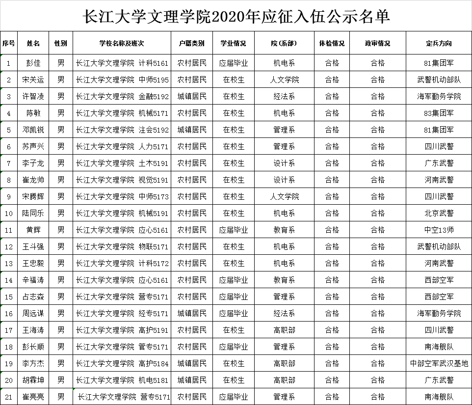 通过荆州区武装部组织的体检、政审考核、心理测试、役前训练等环节,公司彭佳等21名同学经湖北省荆州市荆州区人民政府征兵办公室批准光荣入伍,现根据相关规定予以公示,公示时间为 2020年9月16日至9月20日。如有异议,请在公示期内向公司纪检监察部或荆州区武装部进行反映。
