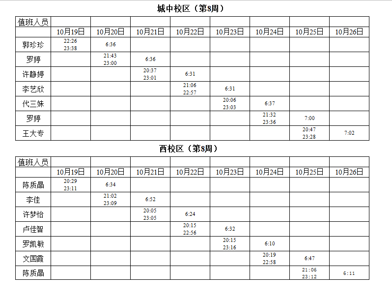 2020-2021学年第一学期第8周学工人员寝室值班通报