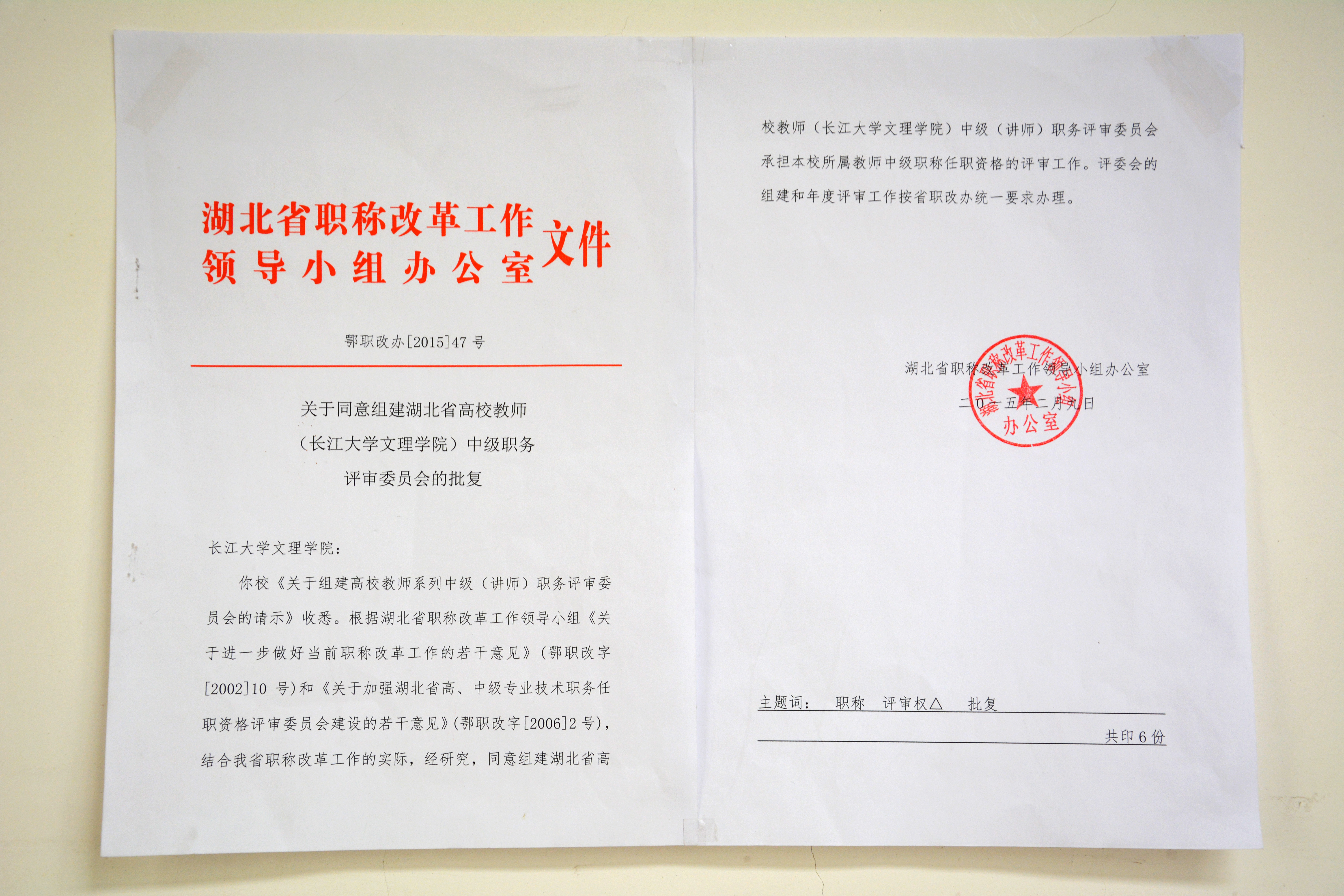 本网讯(通讯员 关莉红)2月9日,湖北省职称改革工作领导小组办公室在鄂职改办[2015]47号文件中批复,公司具有所有专业高校教师中级职称评审权。