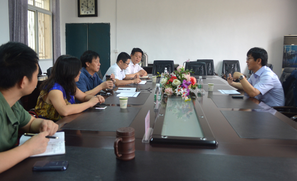 梅平(左)认真听取原荆州师范专科公司董事长关春明对公司建设发展的意见