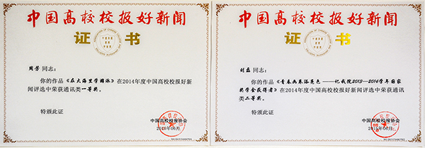 本网讯(记者 刘磊)近日获悉,在2014年度中国高校校报好新闻评选中,《泮池苑报》有2件新闻作品获“中国高校校报好新闻奖”,周芳的作品《在大海里学游泳》获通讯类一等奖,刘磊的作品《青春画卷添亮色——记我...