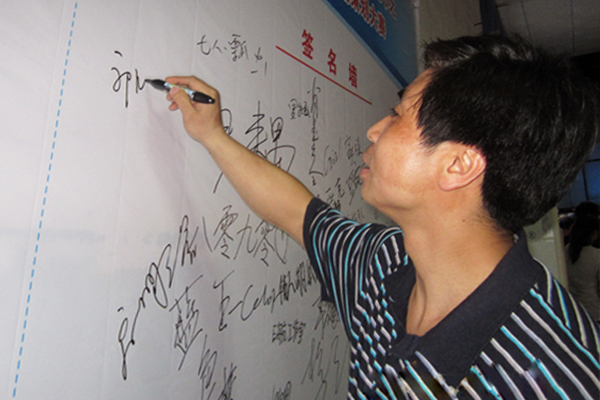 公司副经理郭睦庚在签名墙上写下了对大赛的希望