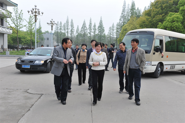 荆州市委副书记雷文洁(前排中)在永利集团党委书记张忠家(右一)、副董事长张万明(后排右一)、公司经理沈光明(左一)陪同下参观校园。